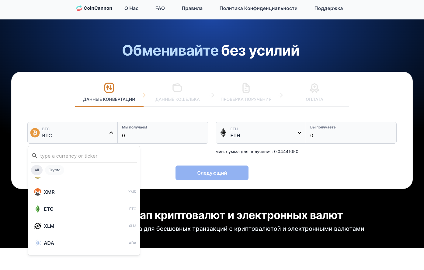 CoinCannon io — сайт обменника, через который предлагают совершать сделки только с криптовалютами. В списке поддерживаемых платежных методов отсутствуют ЭПС и банковские карточки.