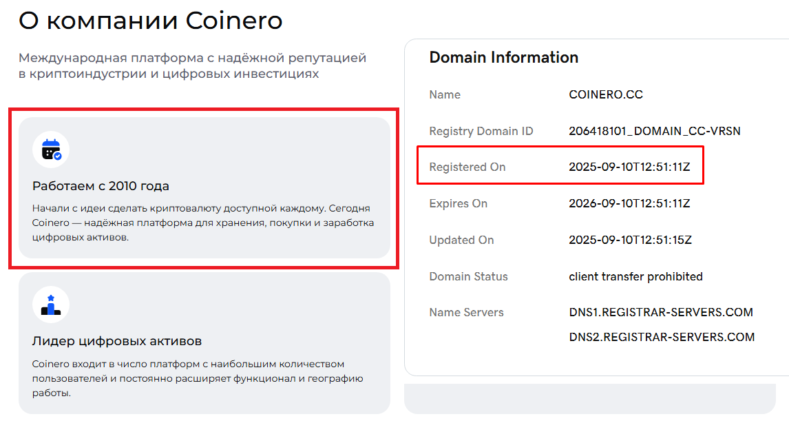 Еще один подозрительный момент — заявления самих представителей платформы. На сайте утверждают, что компания работает с 2020 года, имеет 5 млн активных пользователей и оборот около $10 млрд. Однако проверка домена Coinero Cc показала, что он не имеет долгой истории и был зарегистрирован лишь 10 сентября 2025 года. Очевидно, что достичь упомянутых масштабов всего за три месяца физически невозможно.