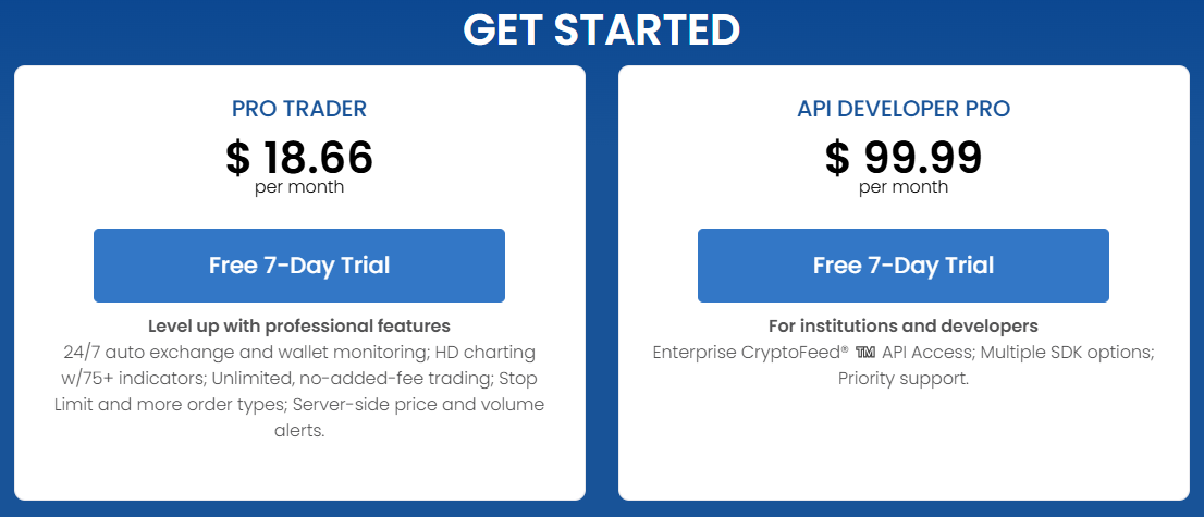 Коиниджи — платный продукт, его использование стоит от $18,66 до $99,99 в месяц. Более дорогой тариф рассчитан на сторонних разработчиков и компании. У Coinigy есть пробная версия на 7 дней с урезанным функционалом.