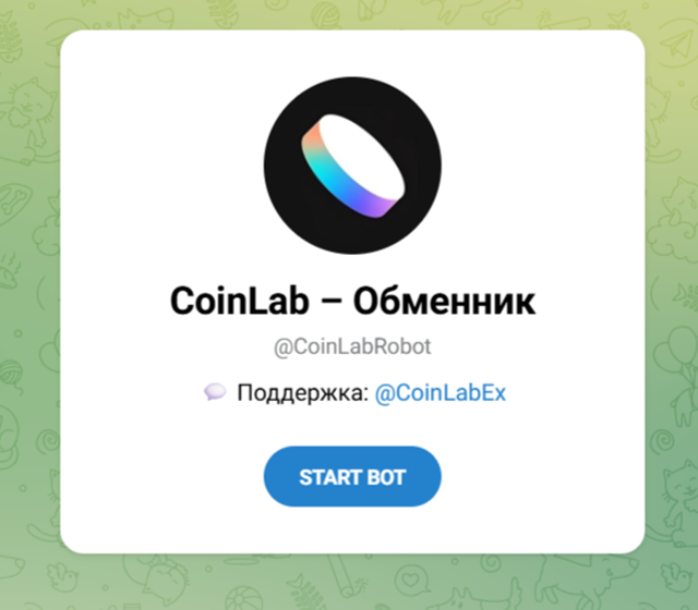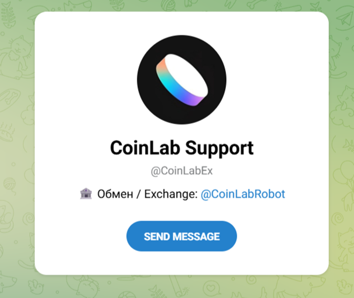 У бота есть поддержка в Телеграме – CoinLab Support или CoinLabEx. Это стандартный аккаунт, предназначенный для приема обращений пользователей. Бот предлагает компетентную поддержку клиентов, но это ничем не подтверждено. Дополнительные контакты обменник не предоставляет.