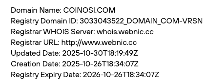 Мы запросили сведения о домене coinosi com из WHOIS, чтобы узнать, когда площадка появилась в интернете. В результате выяснили, что этот адрес был зарегистрирован только 26 октября 2025-го года.