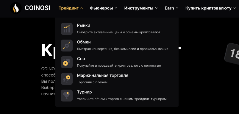 Среди основных функций биржи «Коиноси» заявлены: спотовый и фьючерсный трейдинг, а также маржинальная торговля. Еще в личном кабинете есть раздел, в котором можно проводить свопы цифровых активов.