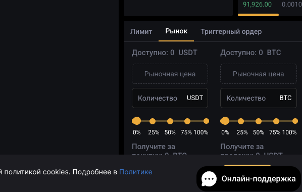 Обращаться в техподдержку сервиса предлагают через форму обратной связи. Кнопка, по нажатию на которую всплывает окно диалога, расположена в правом нижнем углу любой страницы личного кабинета криптобиржи.