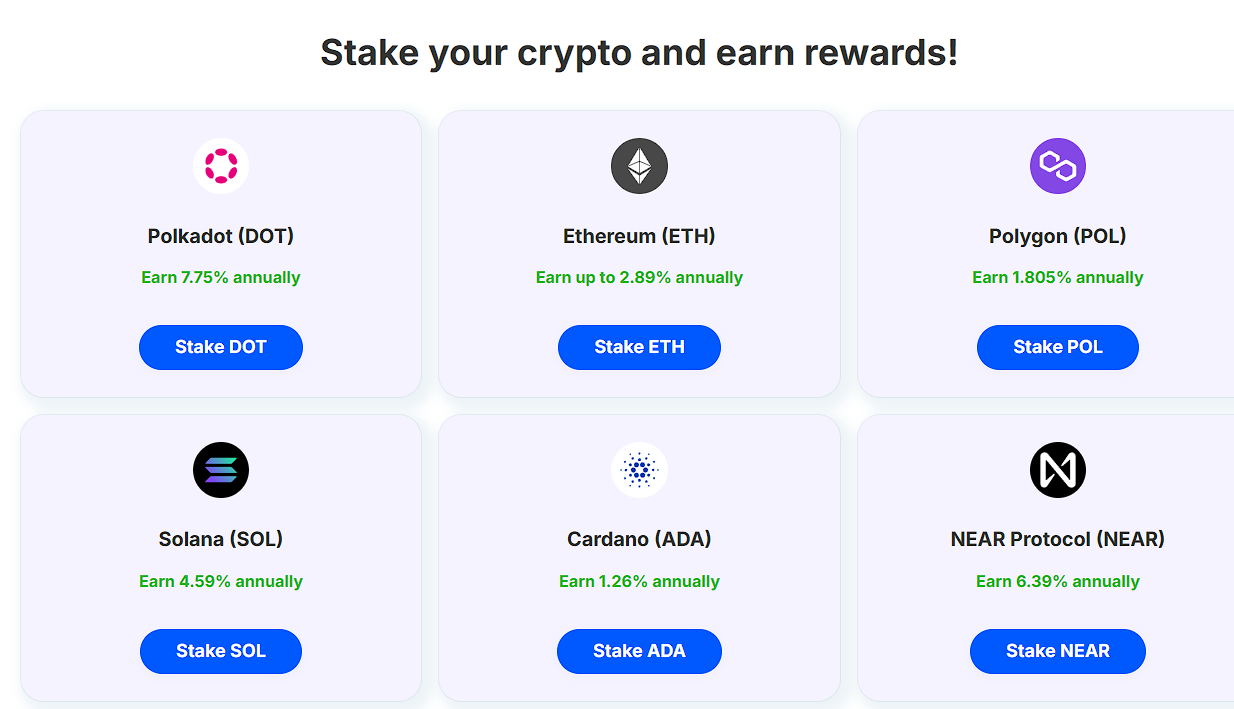 | Стейкинг | Делегирование PoS-активов, автоматическое начисление наград, разные условия блокировки, риск slashing минимизирован. |