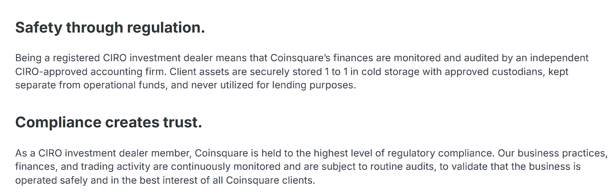Coinsquare зарегистрирована как инвестиционный дилер и вошла в число компаний, которые контролирует канадский финрегулятор CIRO.