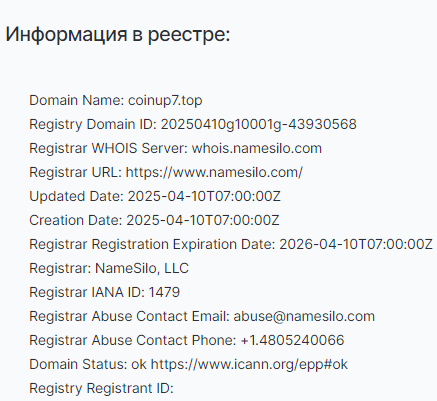 Судя по данным whois, домен coinup7.top зарегистрирован 10 апреля 2025 года всего на год — до апреля 2026. Это свежий проект — ему меньше года. Серьёзные биржи обычно работают годами, что вызывает вопросы к надежности Coinup7. Это странно для сервиса, который хочет казаться серьезной платформой. Краткосрочная аренда выглядит подозрительно.