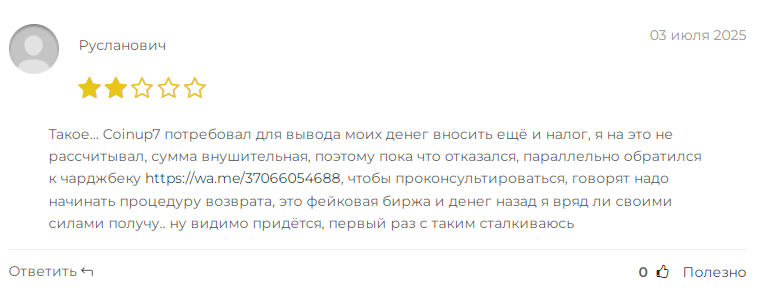 Клиенты Coinup7 регулярно сталкиваются с проблемами при выводе средств. В июле 2025 года пользователь «Русланович» попытался забрать свои деньги. Внезапно ему потребовали оплатить дополнительный «налог». Такой платеж не был указан в условиях заранее. Сумма оказалась значительной, что заставило его обратиться в чарджбек-сервис. Подобные случаи стали системой работы этой платформы.