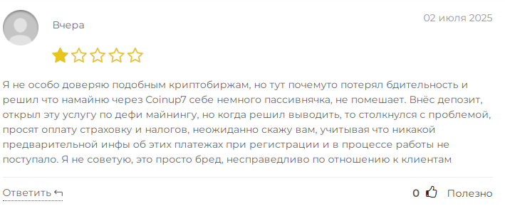 - Пользователи Coinup7 сталкиваются с откровенным обманом. После внесения депозита внезапно требуют оплатить «налоги» и «страховку» — этих платежей нет в первоначальных условиях. Люди не могут вывести свои деньги без дополнительных взносов.
