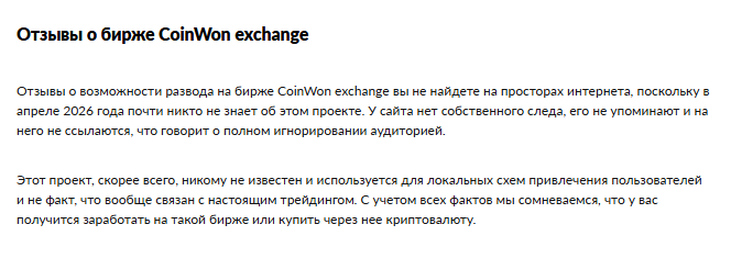 Редакции не удалось найти отзывов о CoinWon exchange. Платформа существует всего месяц и остается неизвестной. Вместо этого начали появляться статьи, в которых авторы анализируют сайт. Домен был зарегистрирован только в марте 2026 года. Платформа является молодой и непроверенной рынком. При этом копирайт в футере указывает 2025 год.