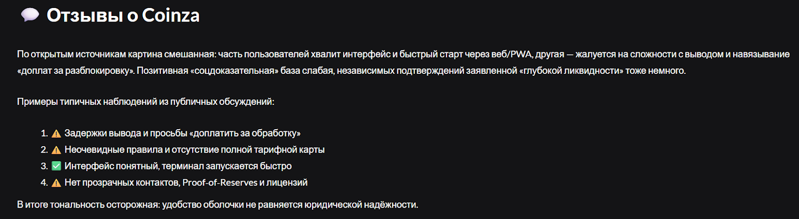 Отсутствие информации о владельцах и лицензиях Coinza Pro вызывает серьезные сомнения в надежности сервиса. Без прозрачности и подтвержденной легальности доверять свои средства такому обменнику крайне рискованно.