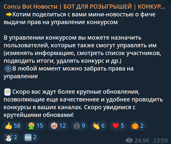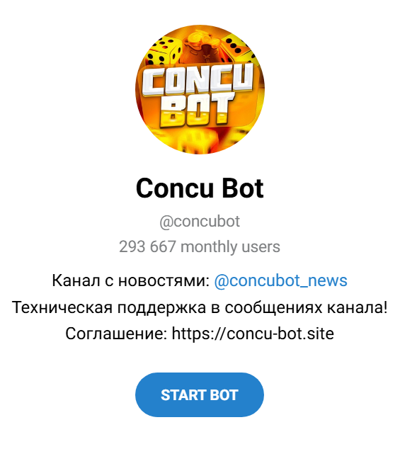 Телеграм-бот Concu Bot (concubot) предназначен для проведения конкурсов в ТГ-каналах. Его функционал бесплатный. Разработчики запустили его в 2022 году. Регулярно они обновляли его функции, о чем сообщали на своем официальном канале «Concu Bot Новости | БОТ ДЛЯ РОЗЫГРЫШЕЙ | КОНКУРСЫ | БЕСПЛАТНЫЕ РОЗЫГРЫШИ | ГИВЫ | КОНКУ БОТ | РОЗЫГРЫШ ПО КНОПКЕ» (concubot news).