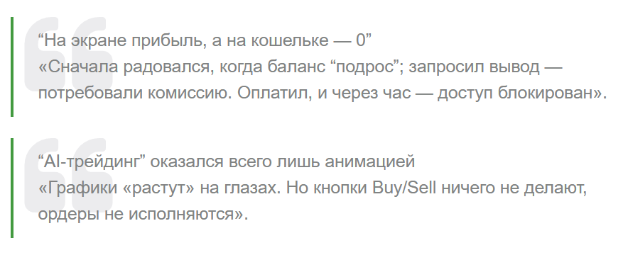Про Web 3.0 в сети пишут в основном плохо, и это важный сигнал. Пользователи описывают классическую схему скама. Чаще всего жалуются на невозможность вывода денег. Средства просят переводить на «сервисные» кошельки админов, а затем начинается цепочка «доплат»: налоги, комиссии, «страховки», якобы для разблокировки. Отмечают и агрессивное давление со стороны представителей проекта. После первого депозита либо пропадают, либо выходят на связь только ради очередных требований «докинуть». Параллельно никакой прозрачности: нет подтверждений реальной торговли, нет проверяемой статистики. Совокупность отзывов рисует понятную картину: это схема, заточенная на выкачивание средств, а не на инвестиции. Потенциальным инвесторам стоит держаться подальше.