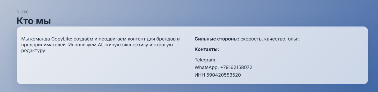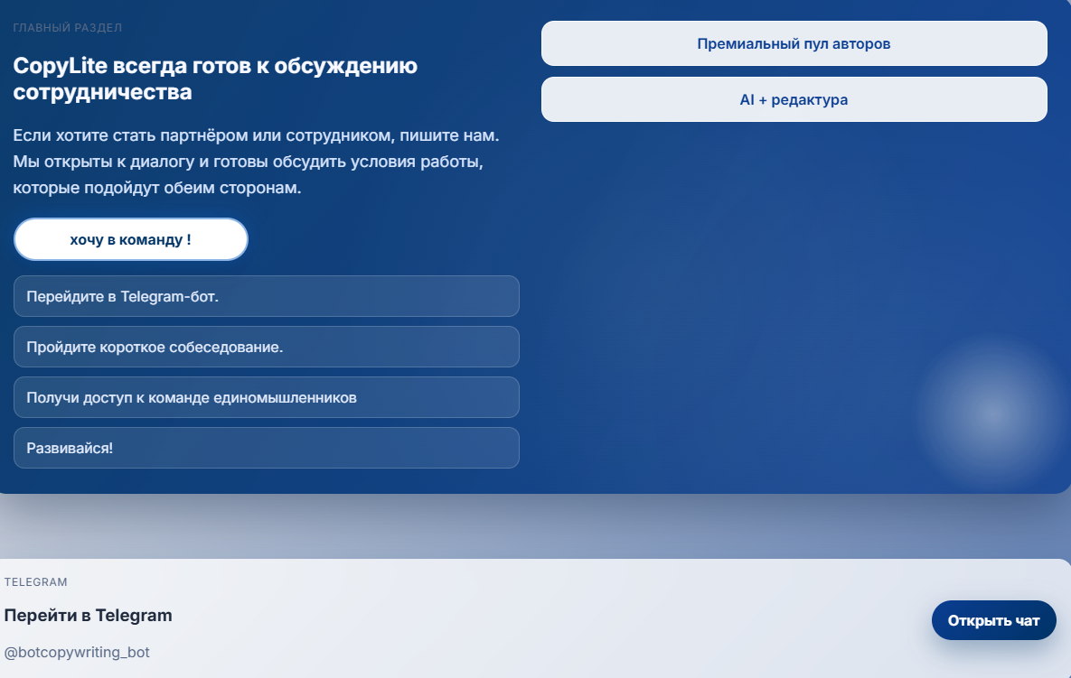 Даже контакты якобы для оформления заказа сводятся к тому, что пользователя просто переводят в бота Copylite.