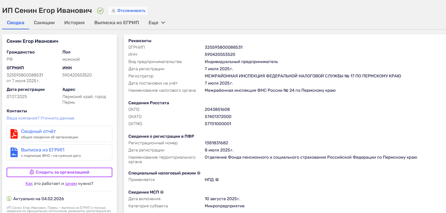 В информации на сайте можно найти информацию о том, что руководит проектом некий ИП Сенин Егор Иванович, который зарегистрировал бизнес в июле 2025 года.