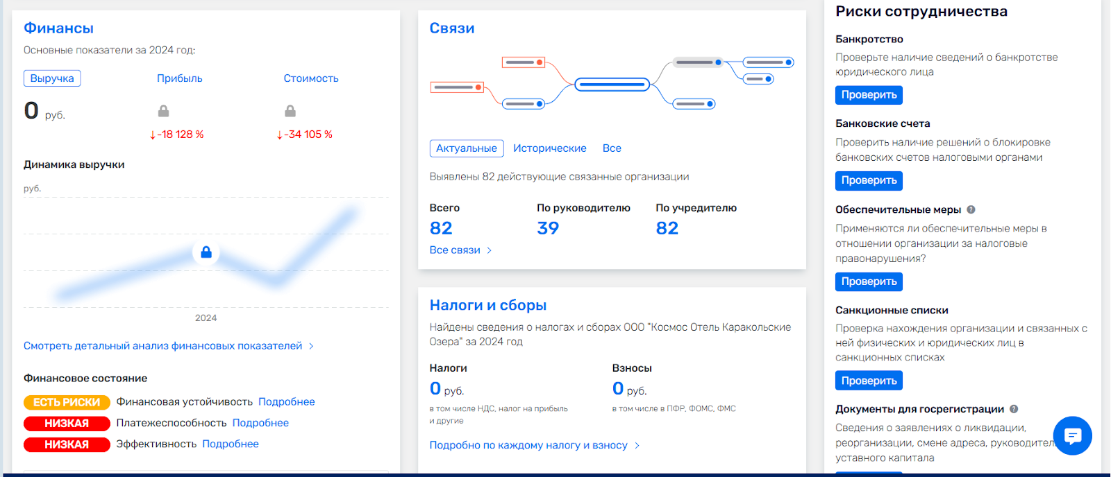 Однако при переходе от идеи к деталям появляются нюансы. Финансовые отчеты ООО “Космос” за 2022–2024 годы показывают, что у компании нет выручки, нет сотрудников и слабые финансовые показатели.
