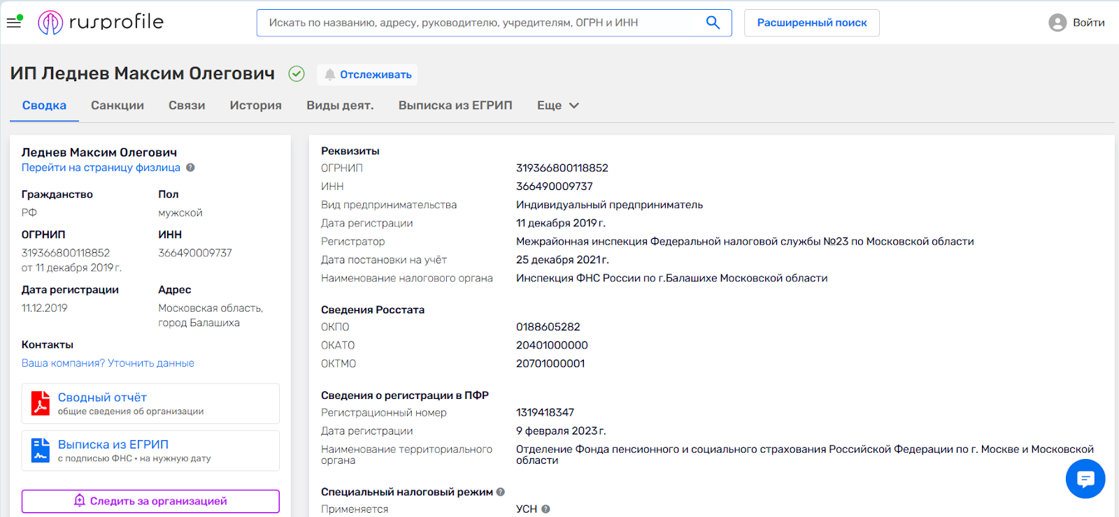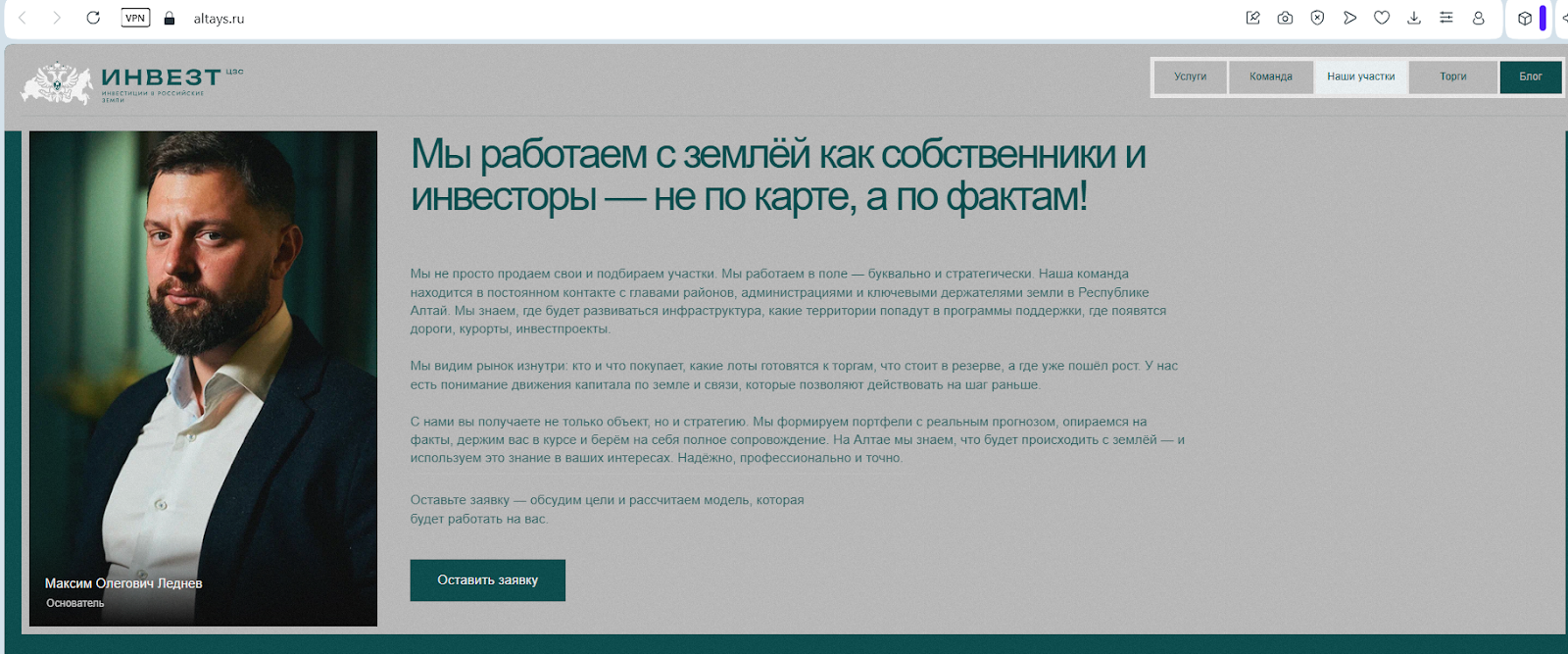 Основателем и публичным лицом “Алтайс” заявлен Максим Олегович Леднев. По данным Rusprofile он зарегистрирован как ИП с 2019 г., основной вид деятельности — рекламные агентства. Профиль деятельности не совпадает с заявленной экспертизой в земле, строительстве и девелопменте.