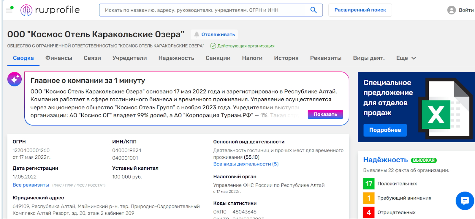 ООО “Космос Отель Каракольские Озера” зарегистрировано 17 мая 2022 г., компания существует без малого 4 года и формально не выглядит как временная структура.