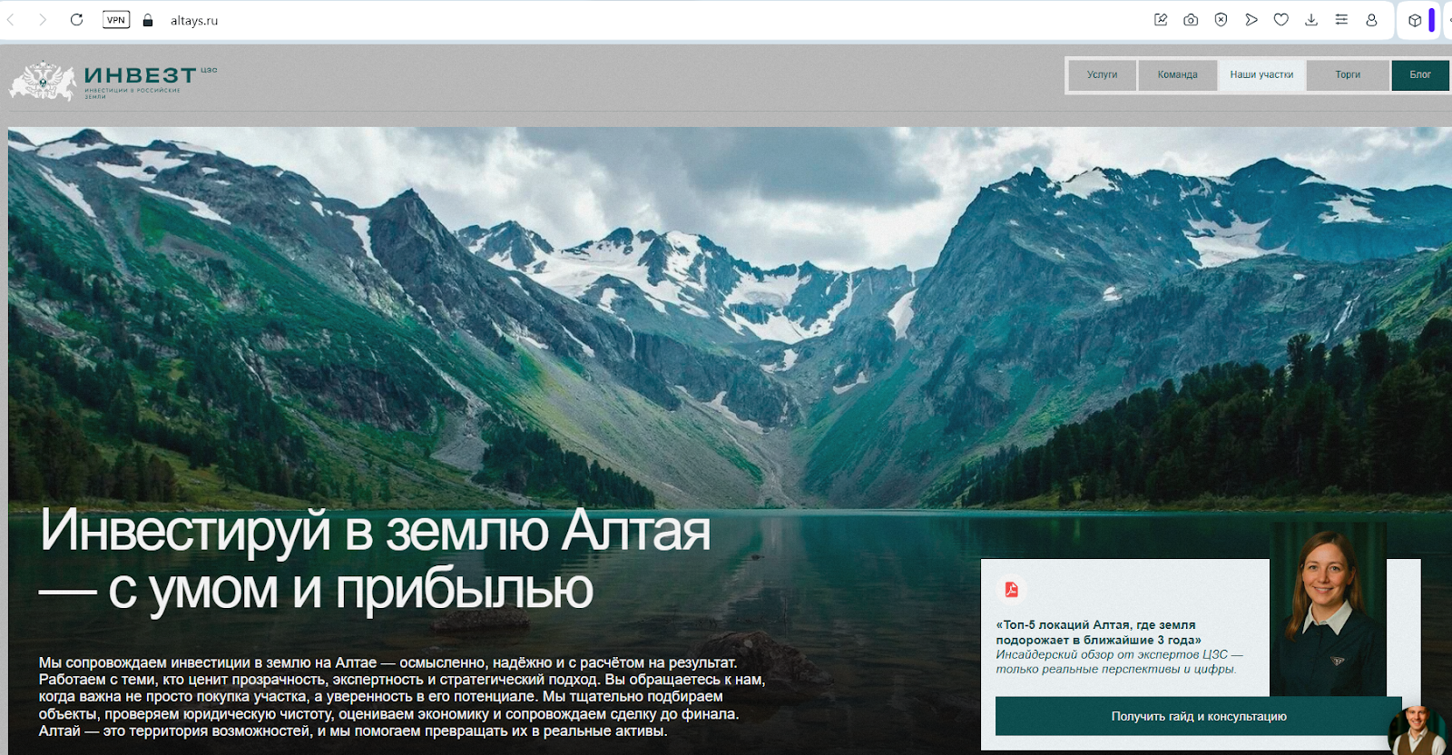 Whois показывает частное лицо, а не компанию. Для инвестиционного проекта это минус, потому что сайт активно предлагает подбор земли, инвестиционные стратегии, сопровождение сделок и формирование портфелей на десятки миллионов рублей, но при этом юридическая ответственность нигде не зафиксирована.