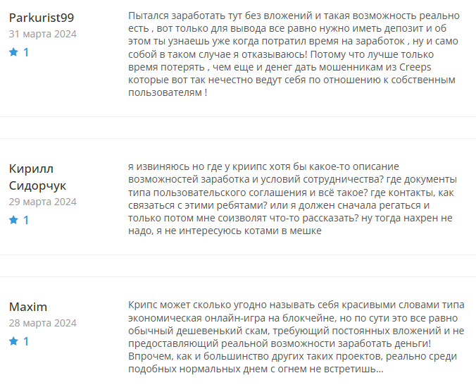 Отзывы о Creeps P2E преимущественно негативные. Пользователи указывают на следующие проблемы: