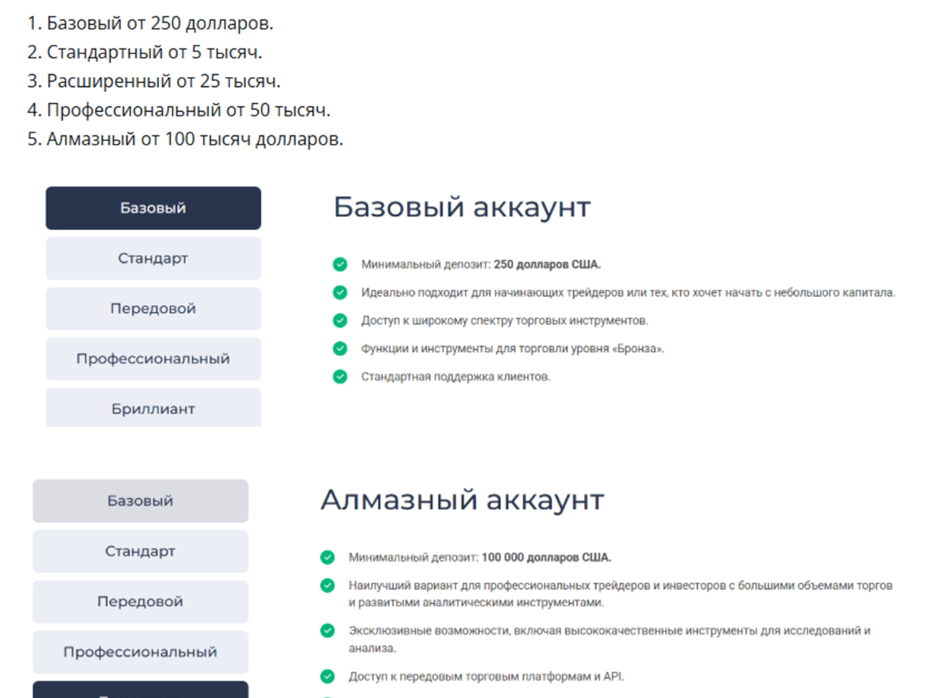 Доступ осуществляется через собственный терминал, который доступен с любых устройств. Мобильного приложения у брокера нет. На выбор трейдеров разработано 5 тарифных планов, стартовый депозит составляет 250 долларов. Детали по каждому из тарифов есть на фото ниже.