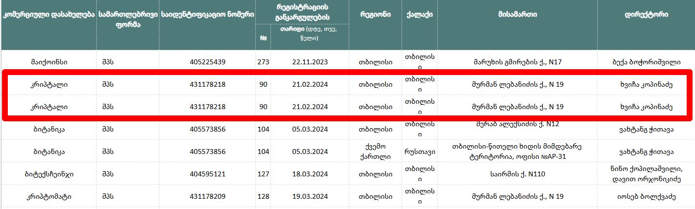 Номер регистрации также указан на официальном сайте Cryptal com – 431178218. Главный офис Cryptal расположен по адресу: г. Тбилиси, ул. Мурмана Лебанидзе, 19. Директором фирмы является Хвича Копинадзе.