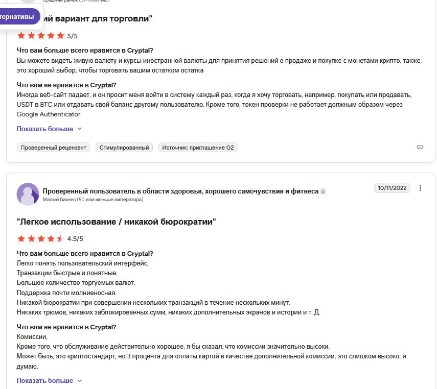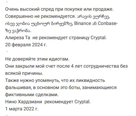 В отзывах часть пользователей считает, что биржа Cryptal Exchange искусственно завышает ликвидность, а ордера создают боты. Помимо этого, люди жалуются на высокие комиссии и спреды, также проблемы с выводом средств. Сайт Cryptal com периодически «падает», что тоже становится поводом для возмущений.
