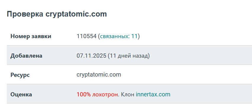 Также один из сервисов по проверке сайтов показал, что cryptatomic com является 100% мошенническим ресурсом. Более того, у него есть еще один клон — innertax com.