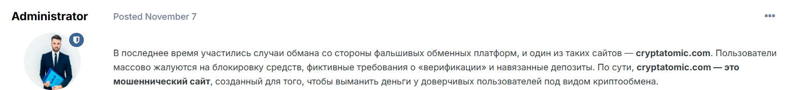 Комментариев пользователей обменника Криптатомик найдено не было. Но в интернете есть предупреждение от некого Administrator. Он говорит, что сайт cryptatomic com мошеннический и его владельцы воруют деньги пользователей под видом обменника. Administrator отмечает, что средства, отправленные на перевод блокируются, а клиента просят пройти платную верификацию. Вот это сообщение: