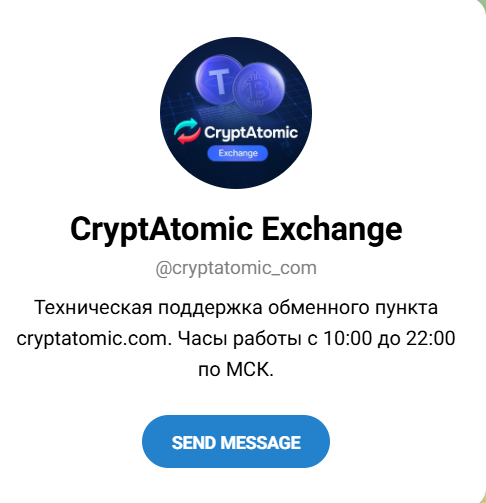 Техподдержка ведется исключительно через страницу в Телеграмм — CryptAtomic Exchange. Специалист отвечает с 10 утра до 10 вечера.