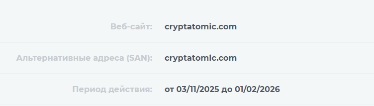 Обменник заявляет о безопасности для пользователей, при этом у сайта нет политики конфиденциальности и оформлен бесплатный SSL-сертификат. Компания не проходила проверку на мошенничество, поэтому оставлять личные данные на cryptatomic com рискованно.