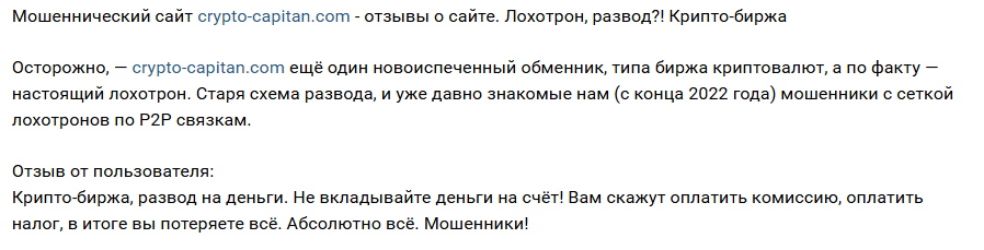 Отзывы о проекте Capitan Crypto в сети только негативные. Первое предупреждение о мошенничестве со стороны обменника появилось в сети в апреле 2024 года. Видимо проект не стал особо популярным, поскольку больше откликов о нем на сторонних ресурсах в сети мы не нашли. Однако, среди представленных обзоров на сайт ни одного положительного мы тоже не увидели, так что репутация у проекта откровенно плохая.