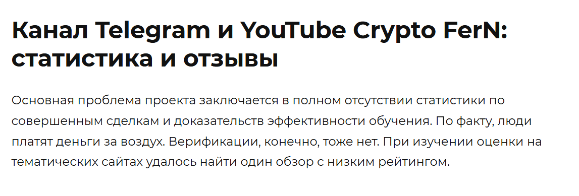 Наша команда не нашла отзывов о Crypto FerN. Но в сети уже начали выходить статьи с разбором его работы. У автора нет своей статистики по сделкам, поэтому оценить, насколько эффективны его сигналы и стратегии, невозможно.