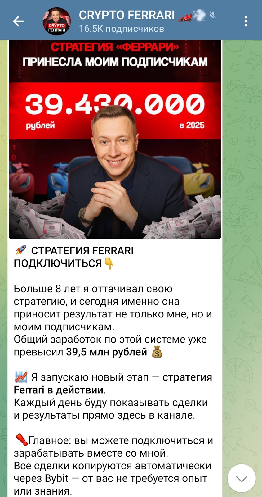 На CRYPTO FERRARI подписано 16,5 тысяч человек, но отзывов о канале и Сергее Пахомове на сторонних ресурсах практически нет. Это не удивительно. Не многие верят в возможность получать на каждой сделке от 100 до 1000% и доверяют свои средства аферисту.