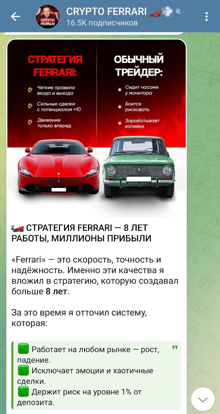 CRYPTO FERRARI 🏎💨 – телеграмм канал анонимного трейдера, который предлагает подписчикам зарабатывать, копируя его сделки. В статье изучим доступную информацию, отзывы подписчиков и сделаем выводы о пользе проекта и рисках для начинающих трейдеров.