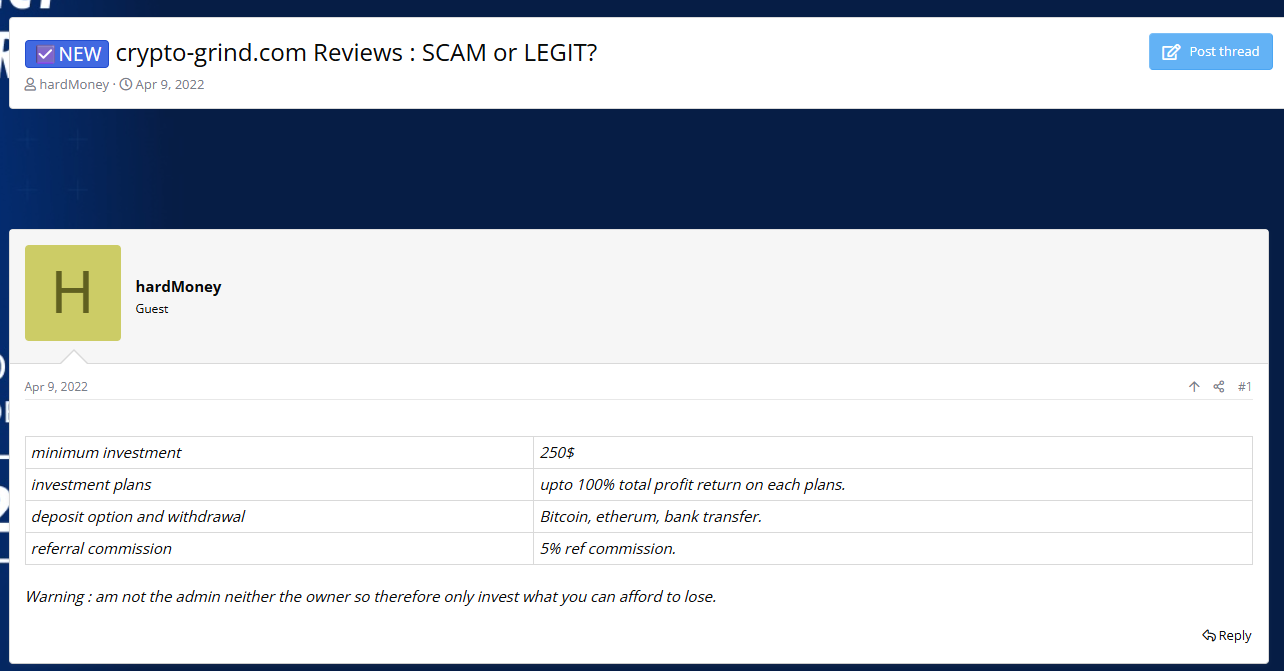 Crypto Grind — очередной пример наглого обмана доверчивых инвесторов. Обещания 100% прибыли в сутки — это явный признак мошенничества. Сайт давно закрыт, а его содержание конфисковано прокуратурой Карлсруэ. Фальшивые отзывы, несуществующая поддержка и клоны других проектов — всё это указывает на отсутствие реальной ценности. Доверять таким платформам — значит выбрасывать деньги на ветер.