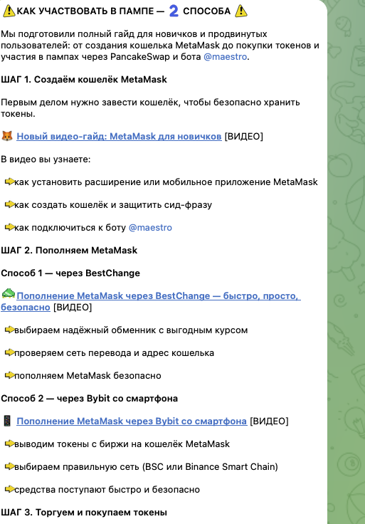 Схема работы сводится к тому, что пользователи по его сигналу должны начать закупать некую монету на Панкейксвапе, а после повторного сигнала – начать продавать. Таким образом якобы за 1 круг они смогут заработать около 500% к балансу. Но в подобных схемах практически гарантированно пользователям предлагают покупать ханипоты, которые они просто не смогут продать. Скорее всего, автор сам запускает токены, которые и предлагает покупать своим жертвам. После этого он просто выводит ликвидность и забирает все внесенные средства, ведь именно он является поставщиком этих токенов.
