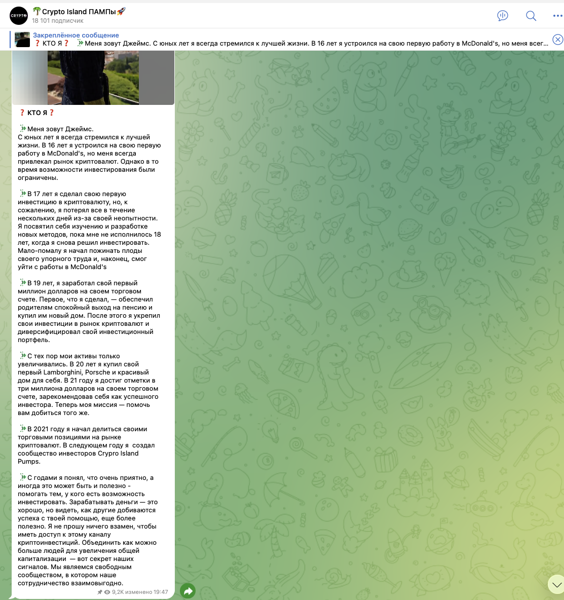 Crypto Island ПАМПы – сообщество в Телеграм от некоего James x100, который рассказывает о схемах заработка на пампинге курса цифровых активов. Автор говорит, что использует схему Pump and Dump для быстрого и кратного увеличения собственных средств, а также вкладов инвесторов. Подобные схемы требуют огромных сумм для работы. Якобы по этой причине автор привлекает инвестиции. Но его деятельность выглядит весьма сомнительной. В обзоре расскажем подробнее о том, что предлагается клиентам площадки.