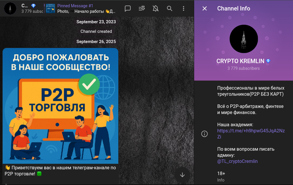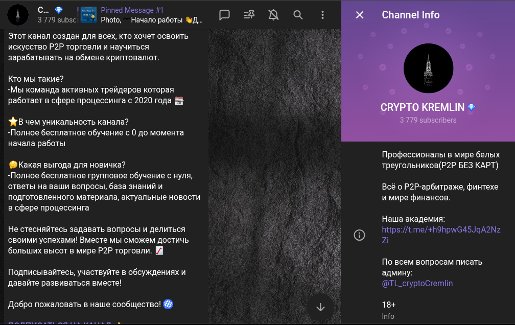 Есть еще ссылка на академию, где новички получают исчерпывающую информацию по сделкам с криптовалютами: https:/ /t me/+h9hpwG45JqA2NzZi. Запуск телеграм-канала Crypto Kremlin был 23 сентября 2023 года. Во вступительном посте, он же знакомство, лектор рассказал детально о проекте. Для начала админ сообщил, что проект подходит всем, кто желает научиться искусству P2p и зарабатывать на этом деньги.