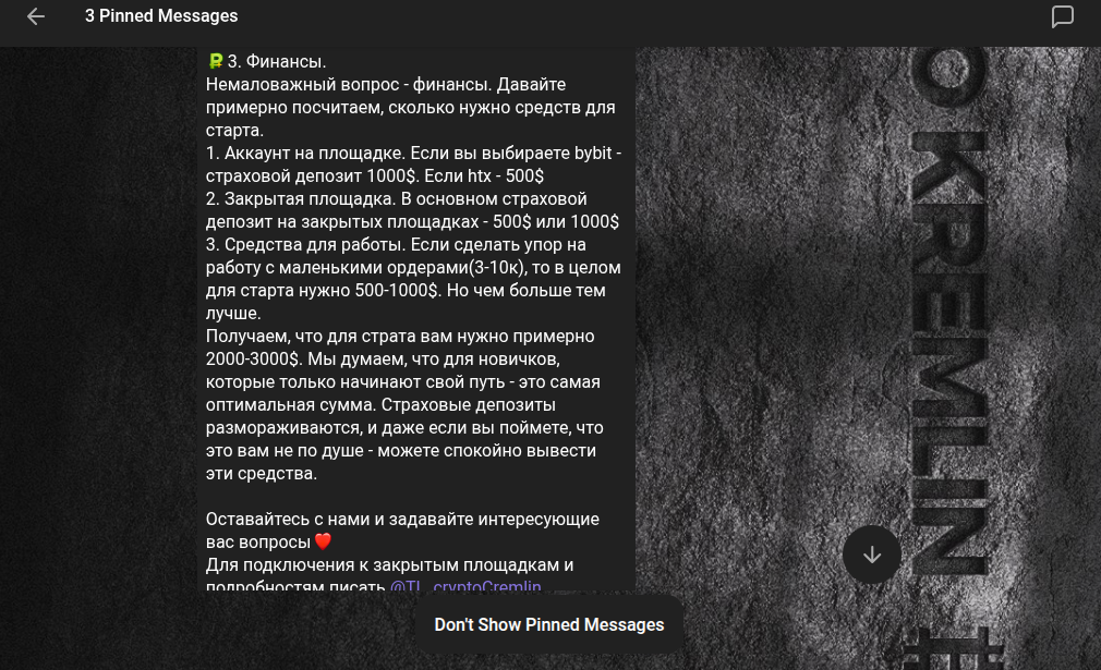 Команда проекта Crypto Kremlin предлагает комплексное сопровождение каждого подписчика к положительному результату плюса к прибыли. Далее автор сообщает про необходимость первых вложений от 2000 долларов, которые подписчики сможет отбить за месяц. Потом надо просмотреть все обучающие видеоролики от бирж и получить статус мейкера на партнерских биржах.