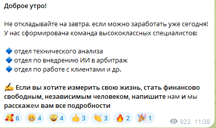 В одном из постов аудиторию призывают «начать зарабатывать уже сегодня». Для этого нужно написать владельцу канала в личные сообщения Телеграм. Это опасная схема: многие мошенники всеми силами затягивают потенциальную жертву в личную переписку, чтобы путем манипуляций заставить ее совершить рискованные и импульсивные действия.