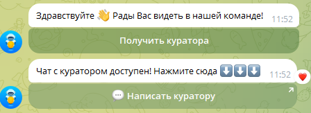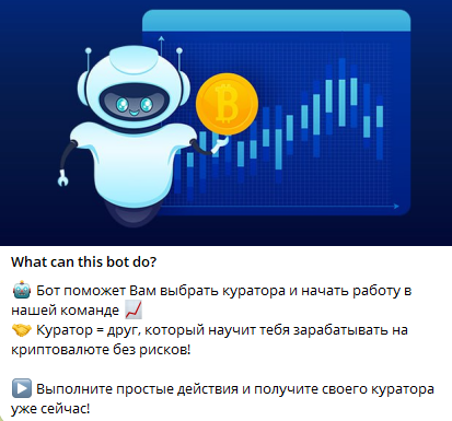 Бот «Получи куратора» обещает предоставить каждому человеку, который подаст заявку, «куратора», который якобы научит его зарабатывать на криптовалюте без рисков. Подобное утверждение выглядит сомнительно: торговля любым активом всегда несет в себе опасность понести убытки.