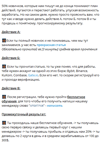 Блогер предлагает новичкам зарегистрироваться на криптобирже, пройти с его помощью обучение и начать торговать криптой, выполняя инструкции, которые он предоставит.