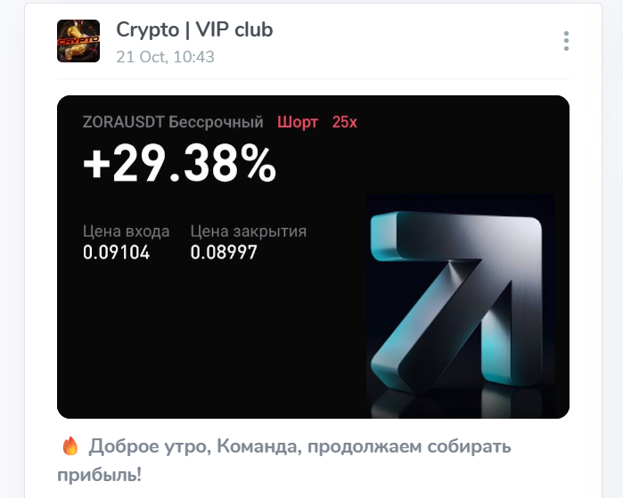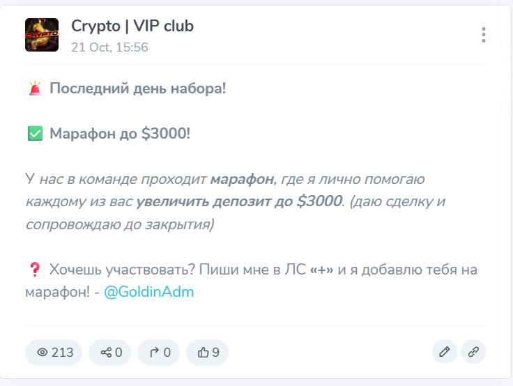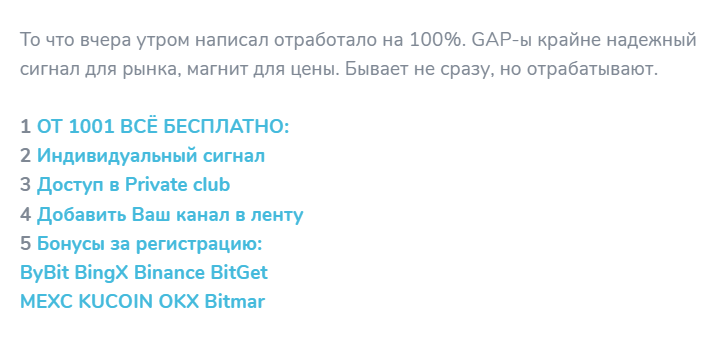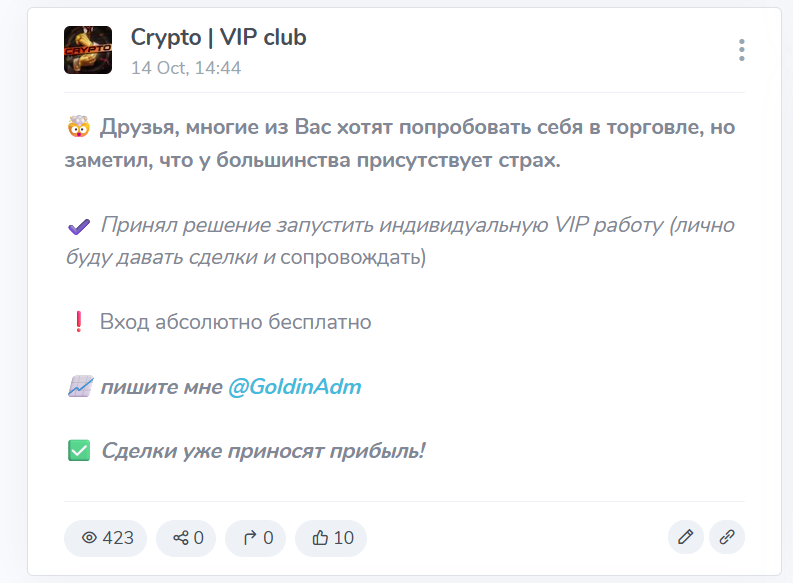 Анонимный трейдер то и дело докладывает своей малочисленной публике о профитах, которые буквально захлестнули как его, так и команду. С них начинается практически каждое утро. Вот только реальных доказательств торговли на площадке нет. Пытаясь заинтриговать подписчиков VIP сделками и секретными данными о мощных импульсах, которые вот-вот произойдут на рынке в ближайшее время, ведущий призывает связываться с ним в личных сообщениях. Все детали раскрываются в другом канале.