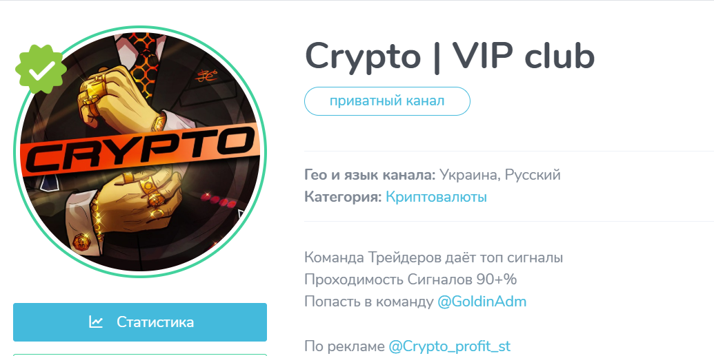 Общая аудитория закрытого канала составляет свыше 8 тыс. участников, однако данный показатель является результатом искусственной накрутки. Записи просматривают 200-400 подписчиков. Администрация проекта – CryptoBP @ GoldinAdm и Crypto St, @ Crypto profit st (по вопросам рекламы). По представленным никам сразу видно насколько “открыты” персоны основателей проекта. Прячут не только имена, но и лица – подобная непрозрачность уже не вызывает доверия к паблику. Заявленная в описании карточки проходимость сигналов превышает 90%.