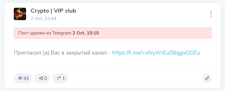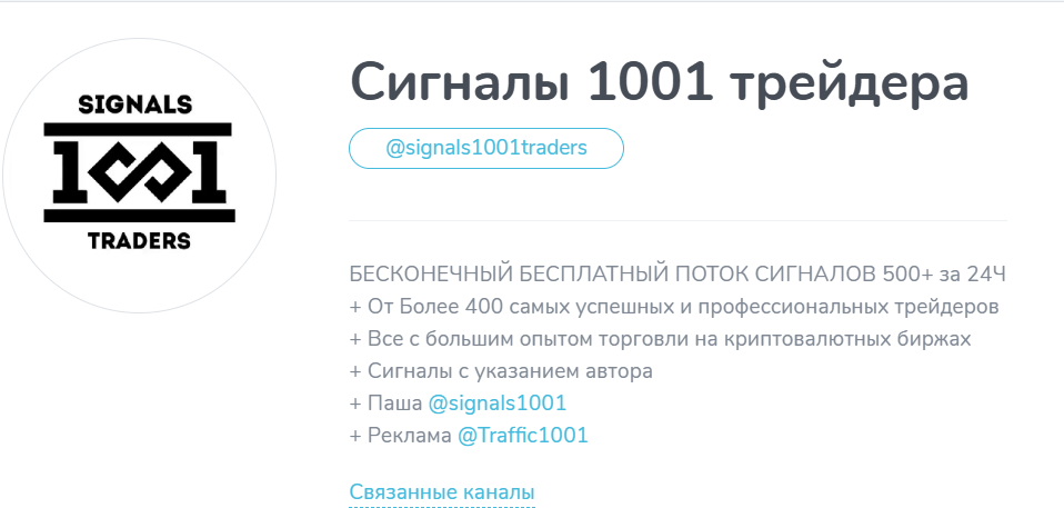 Одно из удаленных сообщений содержало пригласительную ссылку на канал с сигналами – @ signals1001traders. На проект якобы кидаются сигналы из различных пабликов с указанием источника. Таким образом, контент выглядит как полезный концентрат информации для работы, однако все упоминающиеся каналы могут быть партнерскими и работать по той же схеме.