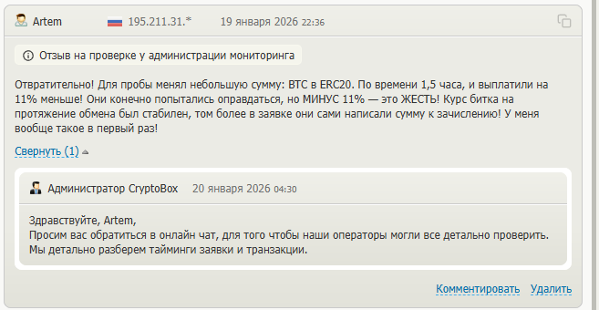 В сети большое количество отзывов о работе обменника CryptoBox. Сначала рассмотрим тот, о котором говорилось выше. Пользователь жалуется на то, что фактически он получил на 11% меньше, чем должен был: