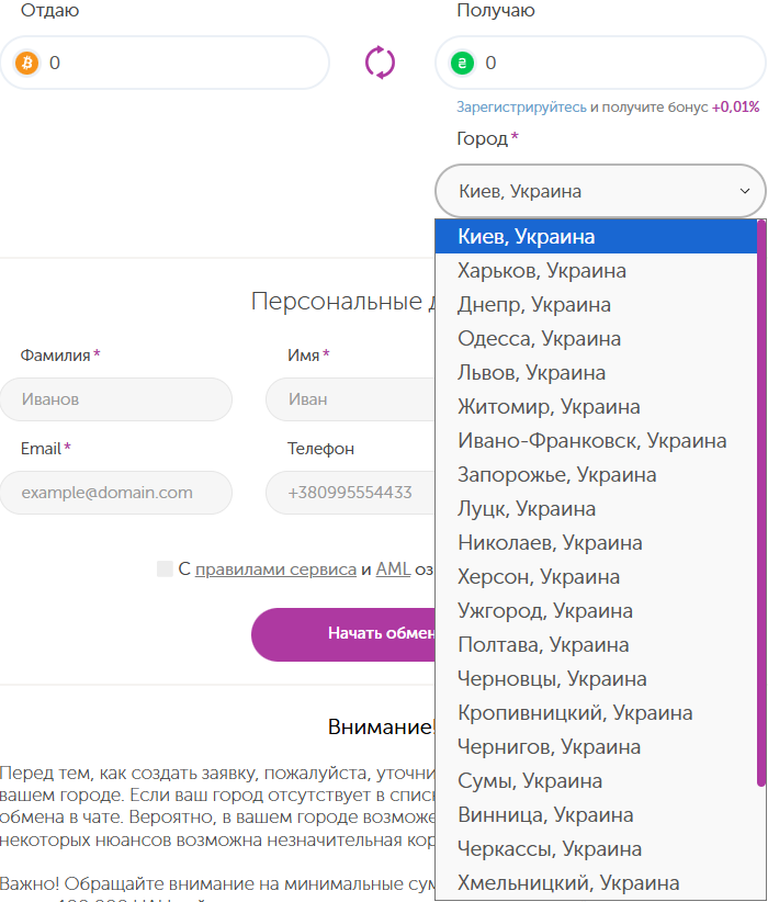 Если посмотреть информацию по обменным курсам, то видно, что основной аудиторией сервиса являются граждане Украины, так как доступен обмен на гривны и выдача наличных в гривнах в разных городах страны.