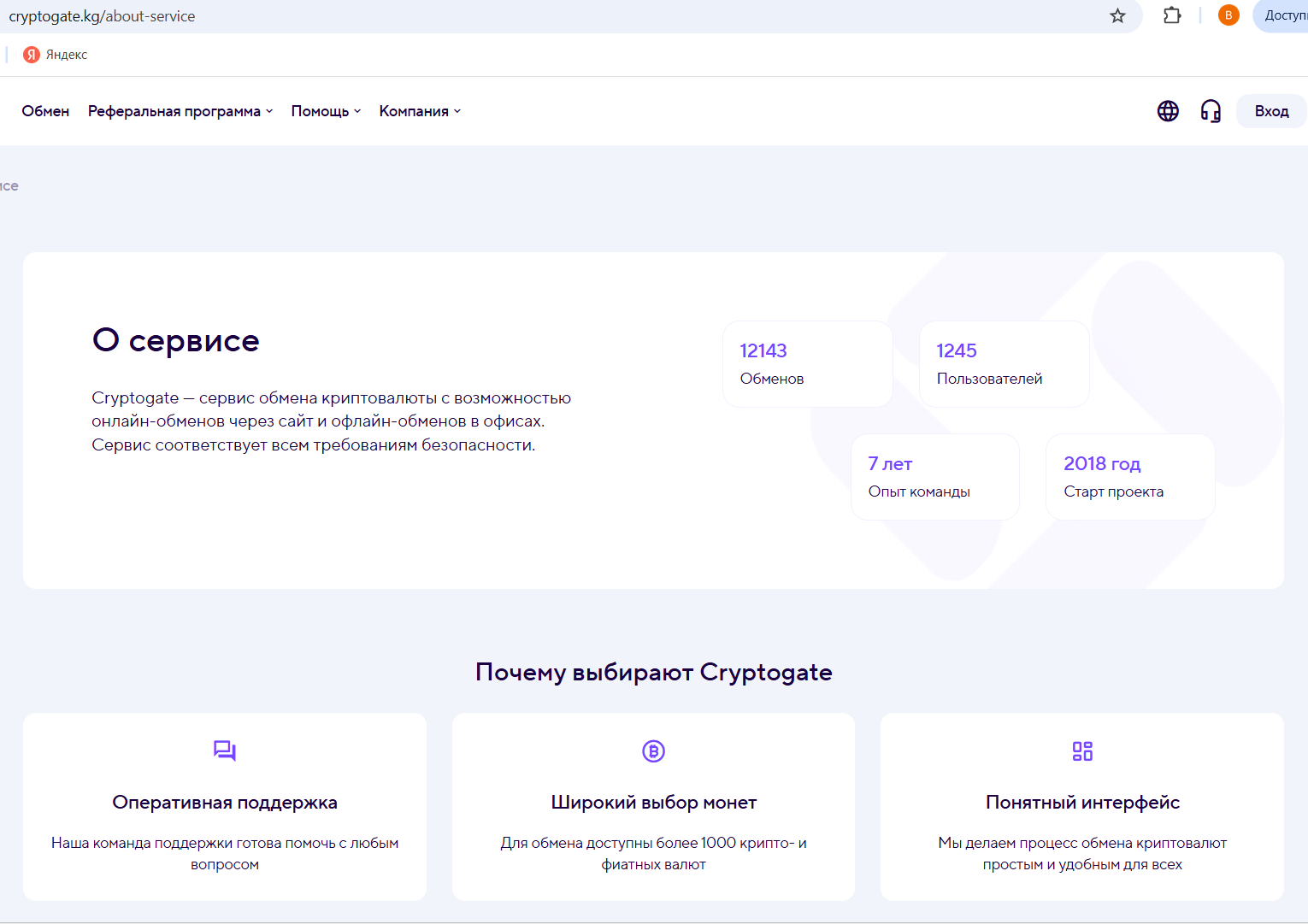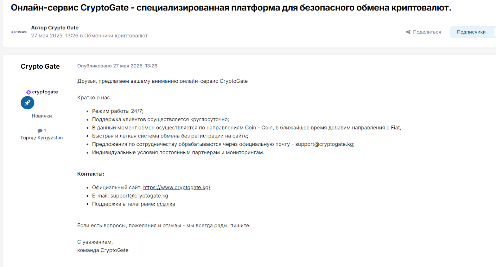На форумах и мониторингах сервис появился весной 2025 года. До этого момента о площадке в сети не упоминается. В сообщении от компании есть информация, что на май 2025 года есть вариант обмена только монета на монету – которых сейчас насчитывается более 1000, на 14 января 2026 кроме BTC и другой криптовалюты прибавилась фиатная валюта – рубли. Отзывы о Cryptogate kg часто говорят, что обмен проходит успешно.