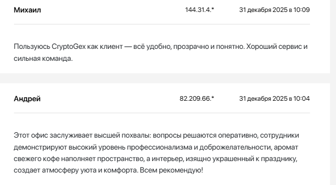 Компания не может похвастаться большим опытом работы. Платформа начала функционировать менее года тому назад. Поэтому подходить к ней следует осторожно: проверять мелким объёмом первую операцию; сохранять все подтверждения и переписки. По возможности – искать независимые отзывы о cryptogex вне каналов проекта перед переводом крупных сумм.