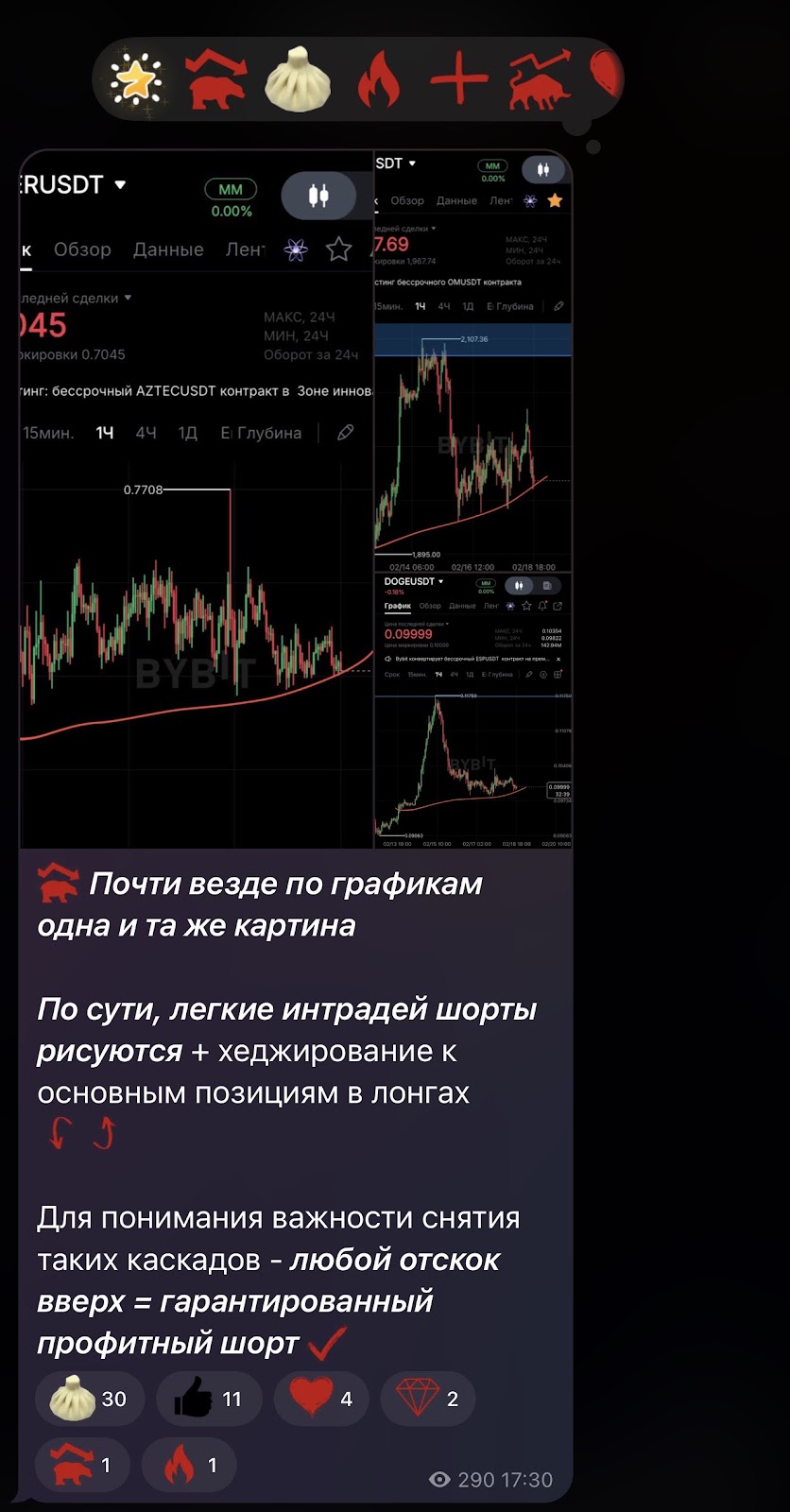 Весь контент вращается вокруг комментирования графиков курсов активов. Однако толковой аналитики здесь нет, а на основании того, что говорит автор, входить в рынок не очень безопасно.